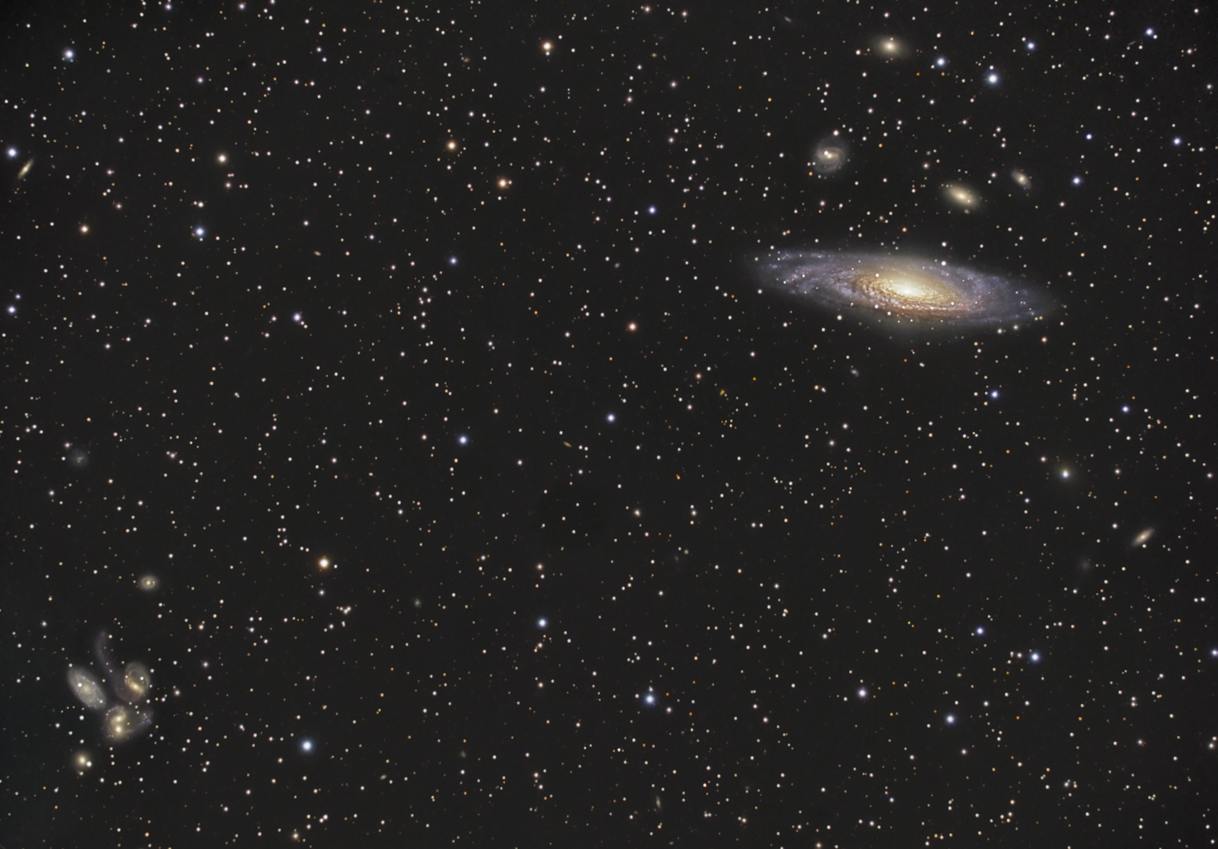 Этот широкий телескопический вид открывается на рассеянные за пределами галактик звезды, находящиеся на северной границе созвездия Пегаса. В правом верхнем углу особенно выделяется NGC 7331. Находящаяся на расстоянии в 50 световых лет огромная спираль является одной из самых ярких галактик, не включенных в известный каталог Шарля Мессье VIII века. Группа галактик хаотичного вида в левом нижнем углу известна как квинтет Стефана. Удаленный на расстоянии в около 300 миллионов световых лет, квинтет хорошо иллюстрирует множественные галактические столкновения, их мощные продолжающиеся взаимодействия, запечатленные на космических снимках. На небе квинтет и NGC 7331 разделены примерно на полградуса.