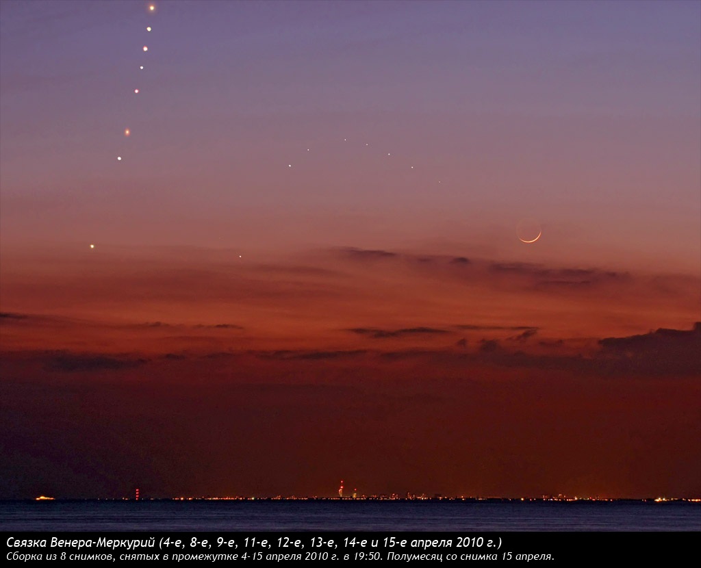 В начале месяца Венера и Меркурий поднялись в западные сумерки, развлекая любителей неба по всей планете прекрасным соединением вечерних звезд. Это изображение скомбинировано из 8, снятых в промежутке с 4 по 15 апреля и можно проследить движение планет в небе над Портсмутом (Великобритания). Каждое изображение было сделано в 19:50. Путь планет начинается слева внизу. Но в то время как Венера дугой идет к заходящему Солнцу, двигаясь выше западного горизонта, Меркурий сначала поднимается вверх, затем опускается вниз. Его самый высокая отметка на этом изображении запечатлена 11 апреля. Конечно же, к 15 апреля к Меркурию и Венере присоединился молодой полумесяц.