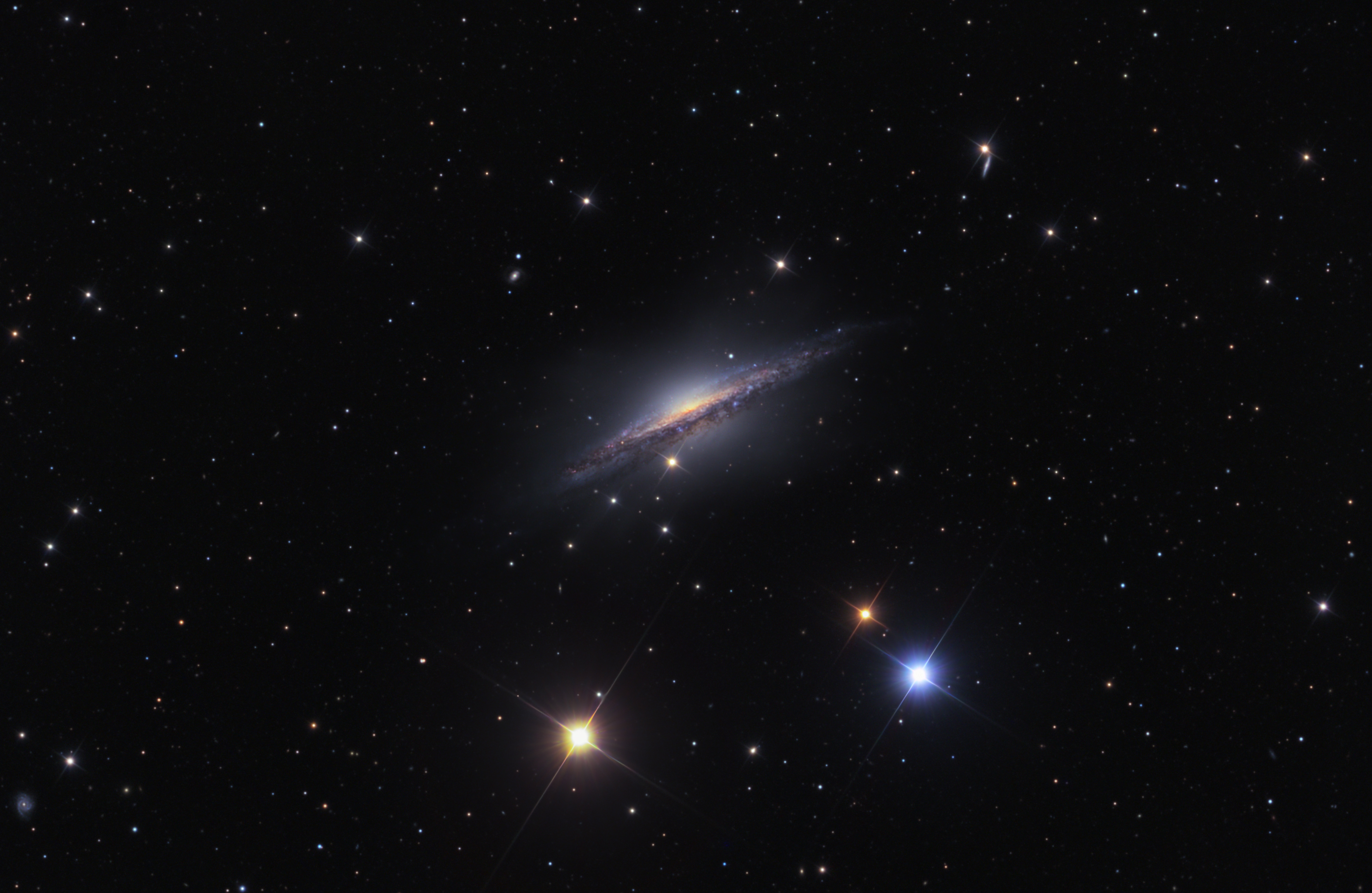 Большая, красивая спиральная галактика NGC 1055 доминирует в малой группе галактик и располагается на расстоянии в 60 миллионов световых лет, недалеко от устрашающего созвездия Кита. Учитывая края, которые можно разглядеть, этот остров Вселенной охватывает примерно 100 000 световых лет, что примерно столько же, сколько и Млечный Путь. На переднем плане космического портрета NGC 1055 видны красочные, остроконечные звезды. Эти звезды относятся к Млечному Пути. Наряду с поверхностным представлением о более удаленных второстепенных галактиках, это изображение также показывает любопытный внутренний ореол в виде формы коробки, простирающийся намного выше и ниже плоскости этой галактики. Сам ореол пропитан слабыми, узкими структурами, и может представлять развалины от спутниковой галактики, разрушенной более крупной спиральной галактикой около 10 миллиардов лет назад.