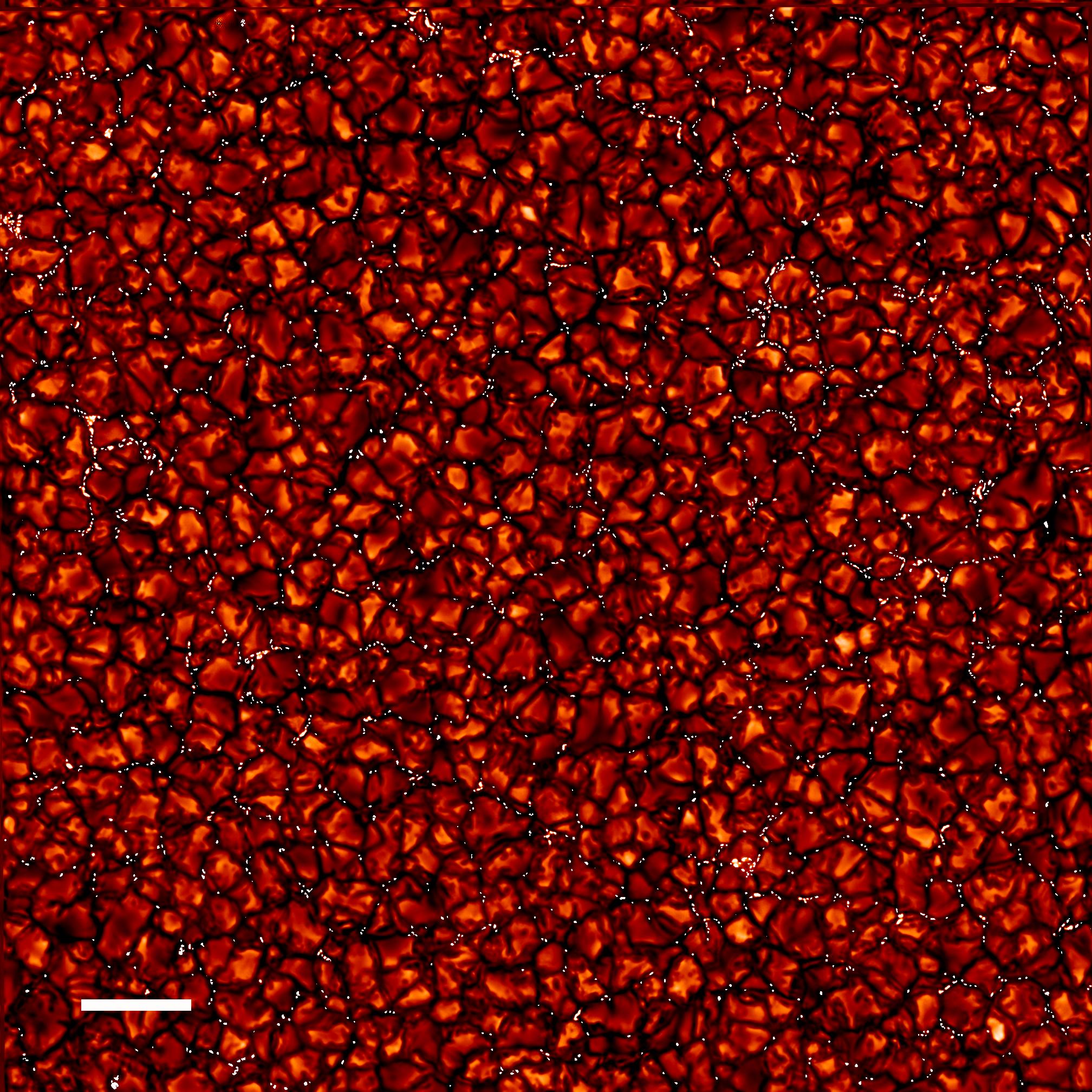При очень близком рассмотрении поверхность спокойного Солнца выглядит как гранулы. Благодаря конвекции столбы поднимающейся плазмы исходят из ярких частей гранул и, охлаждаясь, опускаются в темные части. Но это изображение высокой четкости содержит еще одну интересную деталь: темные полосы усеяны множеством небольших ярких контрастных точек. Точки, присутствуя постоянно на поверхности, позволяют сделать вывод, что их происхождение не связано с циклами солнечной магнитной активности. Тем не менее, точки находятся в районах концентрированного магнитного поля и являются яркими, так как магнитное поле открывает окно к горячим глубоким слоям ниже фотосферы. Для оценки масштаба: белая полоса в нижнем левом углу соответствует 5 000 километрам на поверхности Солнца. Это четкое, узкополосное изображение было сделано в сентябре 2007 года при помощи Шведского Солнечного Телескопа на астрономическом острове Ла-Пальма.