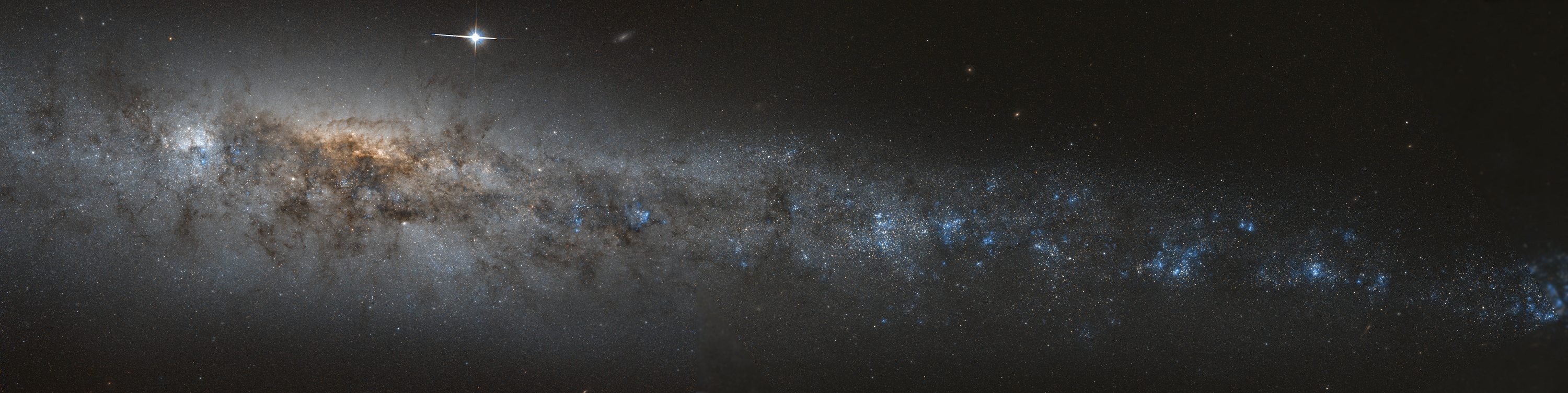 NGC 4631 представляет собой красивую спиральную галактику, рукава которой находятся на расстоянии всего лишь около 30 миллионов световых лет от Земли. Форма этой галактики слегка искажена и из-за ее клиновидности, ее называют галактикой Кита. На этом панорамном виде хорошо выделены темные межзвездные пылевые облака и молодые звездные скопления. Не только ширина NGC 4631, но и ее размер очень схож с нашей галактикой Млечный Путь. Галактика также известна своими выплесками сияний из горячего газа и рентгеновских лучей. Галактика Кита охватывает область размером около 140 тысяч световых лет и может быть видна в телескоп в созвездии Гончие Псы.