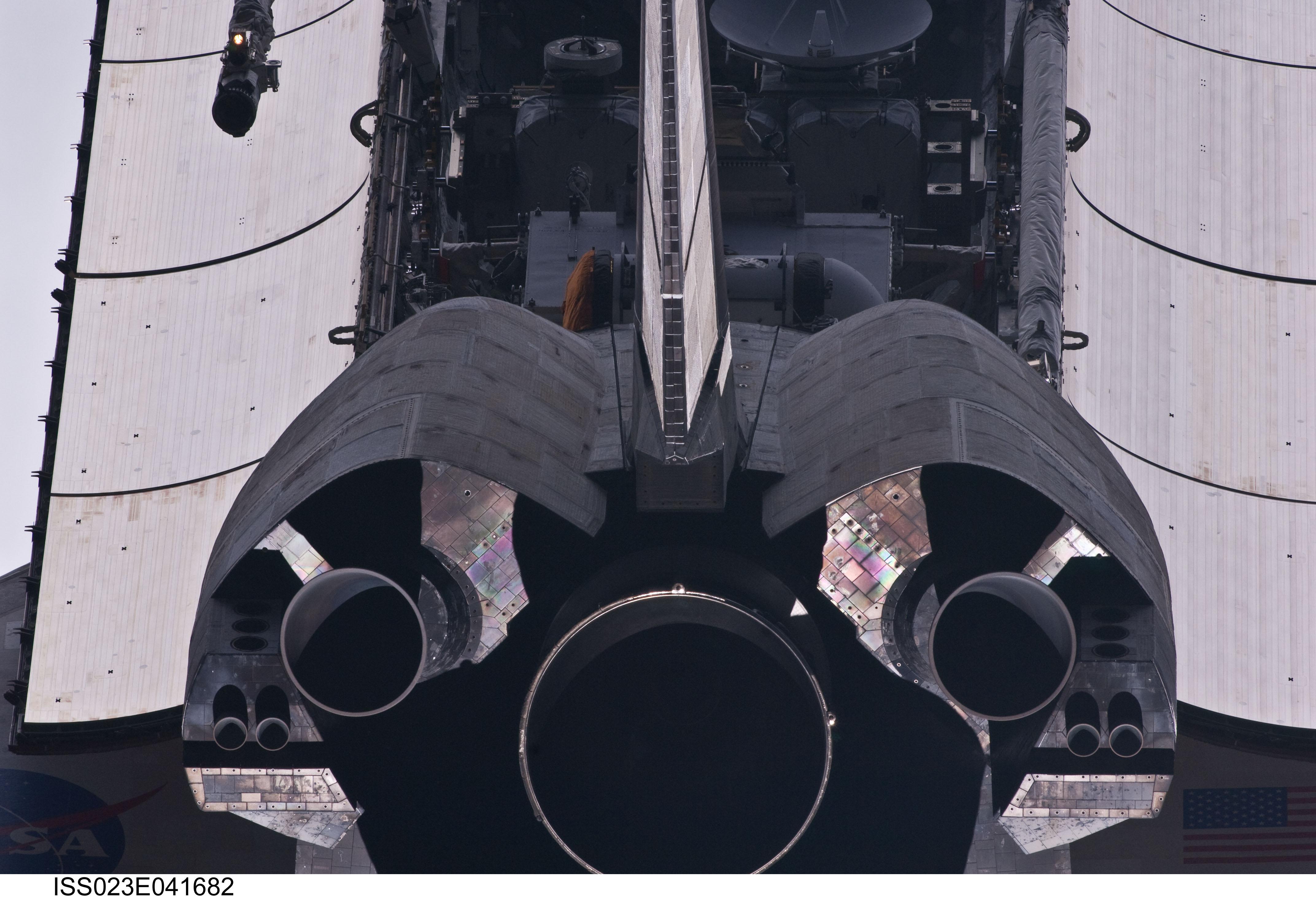 Эта фотография «Атлантиса» позволяет нам разглядеть его основные двигатели, части грузового отсека, вертикальный стабилизатор и орбитальную маневровую систему отделяемого грузового отсека. Снимок был сделан командой 23-й экспедиции в течение наблюдения за стыковкой космического челнока. В рамках этого наблюдения, как и при каждой экспедиции, челнок выполнил обратный «кувырок» во время сближения. Снимок был сделан с использованием линз 400mm на расстоянии около 600 футов (180 метров).