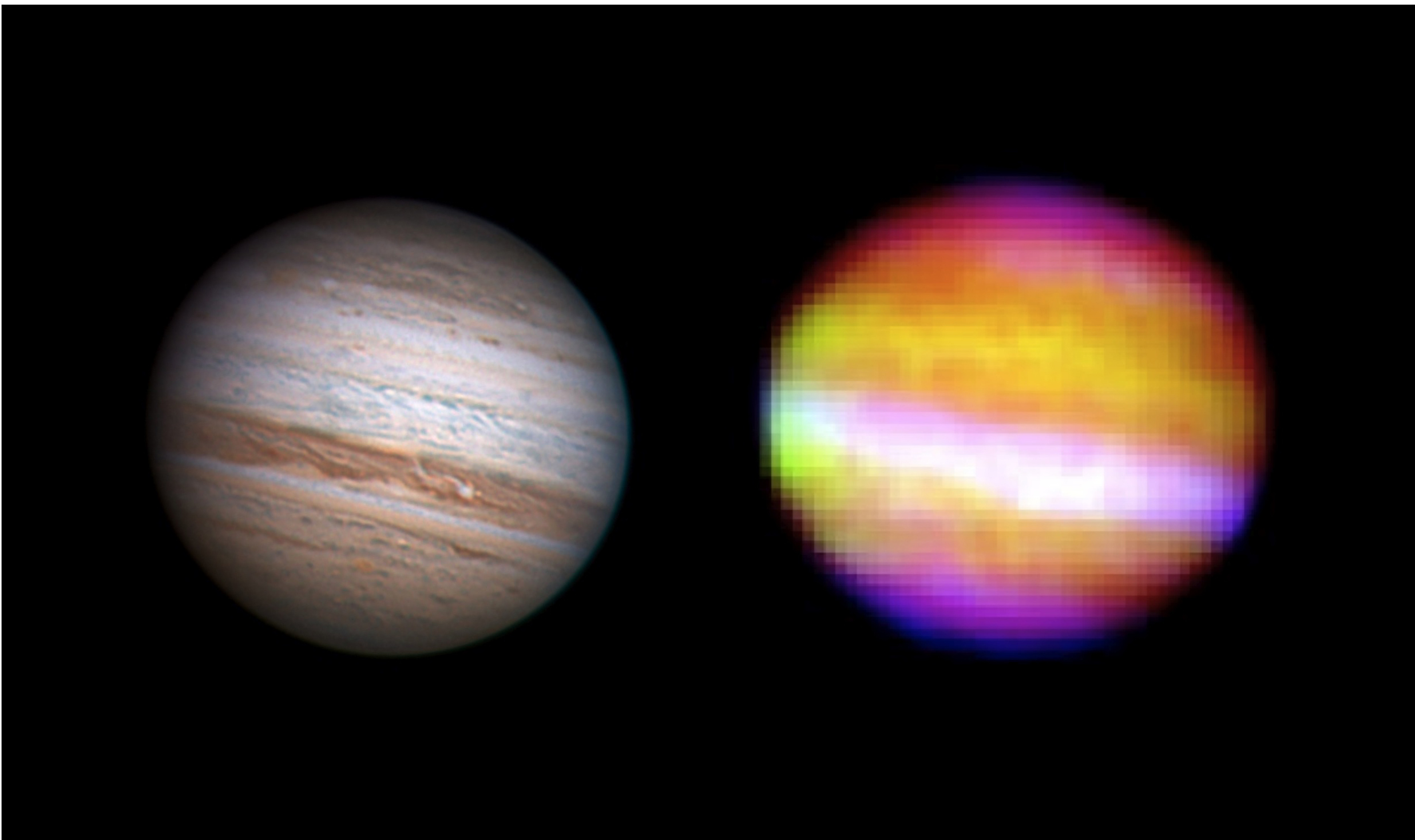 SOFIA, обсерватория для инфракрасных снимков сделала свою первую фотографию 26 мая на высоте примерно 10 с половиной километров. Вылетая за пределы облаков, которые поглощают инфракрасное излучение, SOFIA сняла этот снимок Юпитера (справа), который представлен нам в искусственных цветах. Для сравнения, слева представлена наиболее новая фотография в видимом свете с Земли. На обоих снимках представлен крупнейший газовый гигант Солнечной системы, Юпитер без его южного экваториального пояса (который виден в верхней полусфере из этого ракурса). Пояс пропал в начале мая. Но яркая белая полоса на снимке с SOFIA является областью облаков Юпитера, прозрачными для инфракрасного света, и позволяет нам увидеть, что под ними.