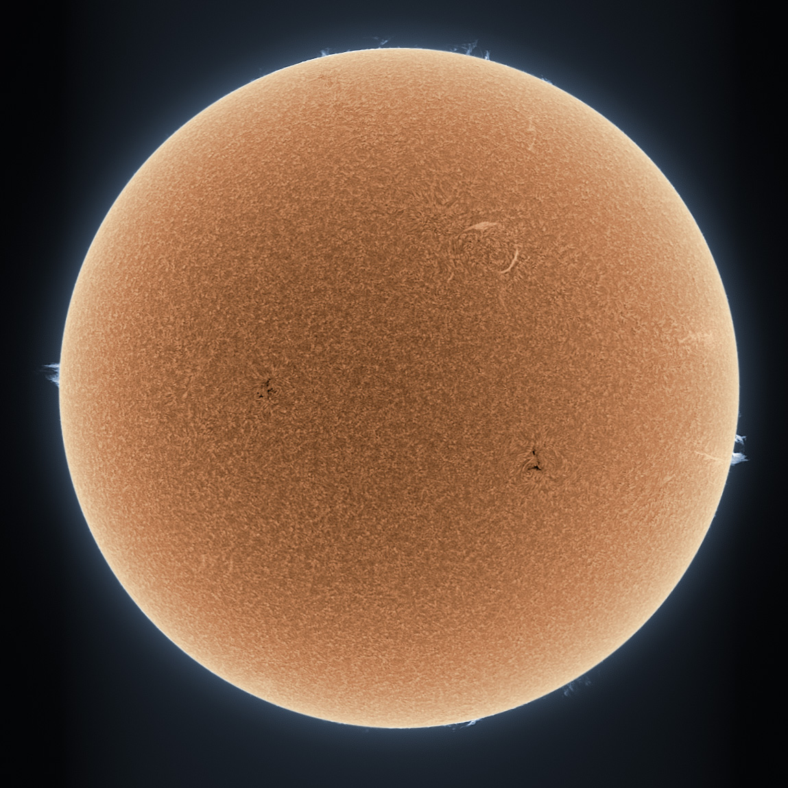 Даже спокойное Солнце может быть занимательным. Наше Солнце в последние несколько лет необычайно спокойно. Этот снимок был сделан на прошлой неделе в единственном свете, который называется H-Alpha, и искусственно раскрашен, что позволяет нам увидеть огромное количество деталей мерцающей поверхности нашей звезды. Градиентное изменение цвета у края Солнца, которое определяется потемнением к краю (так как цвета инвертированы), вызвано увеличенным поглощением относительно прохладного солнечного газа. На краях видны несколько протуберанцев, и два протуберанца – на поверхности, в виде светлых полос, немного правее и выше центра изображения. Две особенно активные области Солнца отмечены темными пятнами. Учитывая прошедшие спокойные времена Солнца, теперь в течение долгих лет ожидается рост его активности.