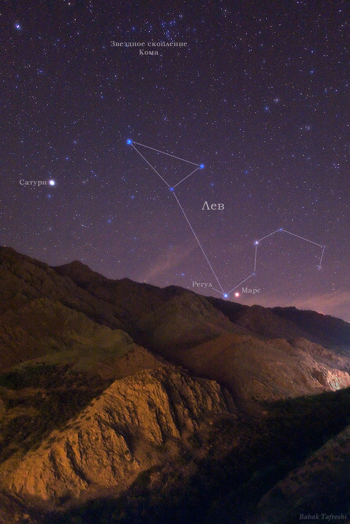 Королевская звезда Льва Регул и красная планета Марс появились в красочной паре над горизонтом в звездном небе. Фотография была сделана 4 июня в деревне Ораман горного региона Курдистан на западе Ирана, недалеко от границы с Ираком. Резкий контраст цвета Марса и ярко-голубой звезды позволяет их легко различить невооруженным глазом, но еще больше их заметно на этой фотографии из-за диффузионного фильтра. В западной части вечернего неба за горы уже зашла бриллиантовая Венера. В левой части изображения блестит Сатурн.