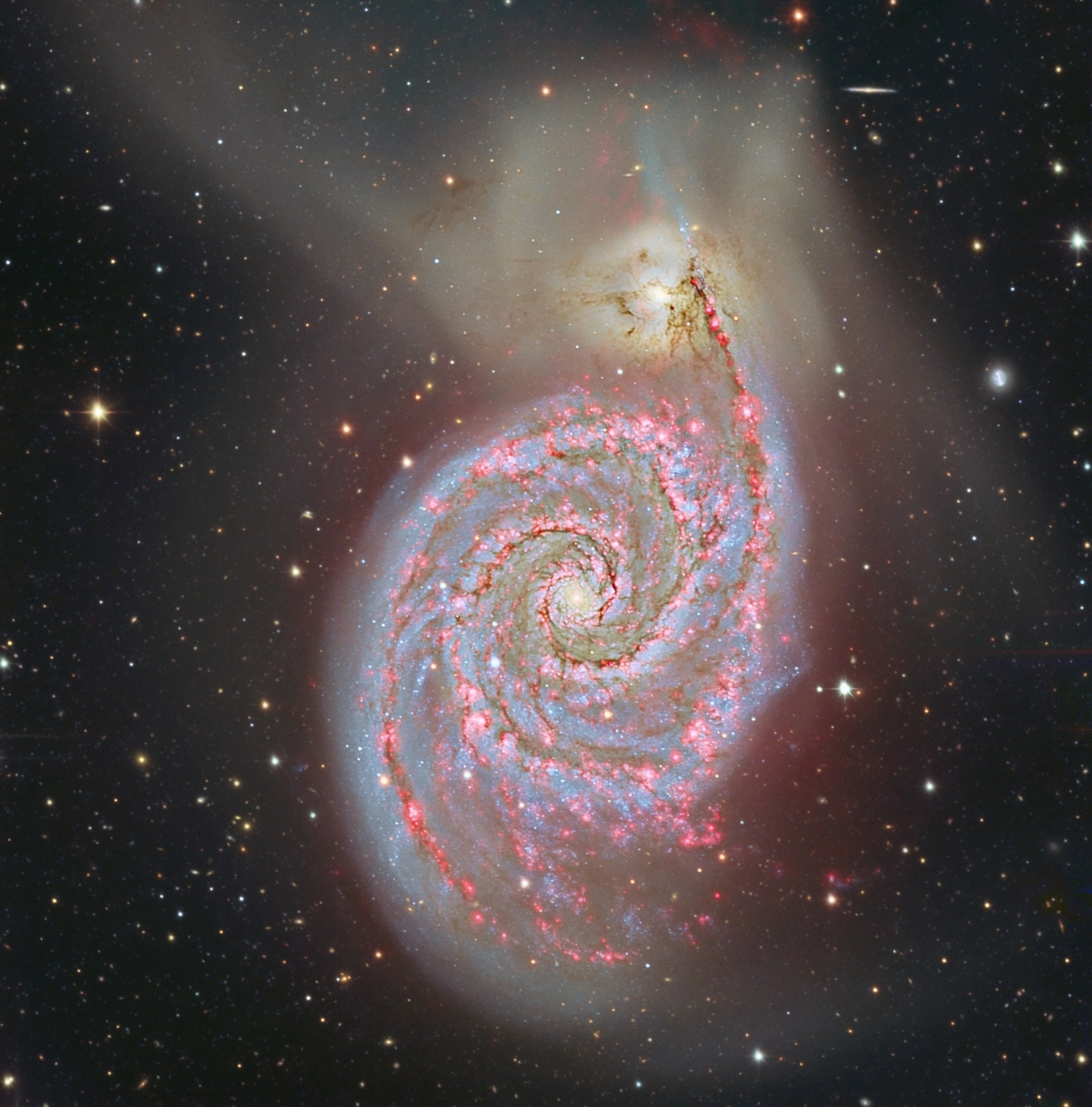 M51 – большая галактика, охватывающая свыше 60 000 световых лет. Она имеет ярко выраженную спиральную структуру. Кроме того, будучи каталогизированной как NGC 5194, M51 является частью известной пары взаимодействующих галактик, ее пылевые облака и пылевые полосы будто бы подметают соседнюю галактику NGC 5195 (вверху). Этот захватывающий искусственно раскрашенный снимок был сделан в обсерватории Калар Альто. Длительная экспозиция была использована совместно с узкополосным фильтром альфа водорода, который является следом излучения атомарного водорода. Красноватые области – области выброса водорода, также называемые H II областями. Эти области расположены преимущественно вдоль рукавов. Любопытно, что это искусственное окрашивание также показывает красные структуры излучения водорода даже рядом с NGC 5195.