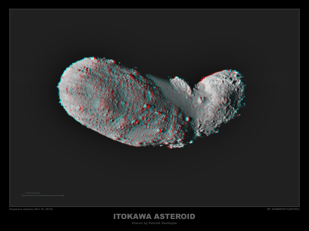 Наденьте свои красно-синие очки и ощутите себя рядом с астероидом Итокава, рядом с этим миниатюрным миром в Солнечной системе, размером всего 500 метров. По его шероховатой поверхности разбросаны валуны, а отсутствие кратеров говорит о том, что астероид состоит из щебенки, собранной в кучу под силами гравитации. Это 3D изображение было сделано из фотографий, снятых космическим аппаратом Хаябуса, когда он неудачно приземлился на астероид в 2005 году. После длительного путешествия этот аппарат вновь вошел в атмосферу Земли 13 июня над Австралией. Его капсула с парашютом успешно приземлилась. Она могла содержать образцы материала, из которого состоит Итокава.