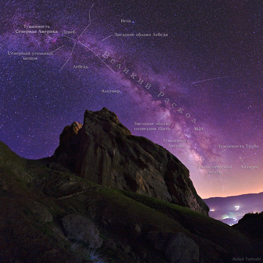 След метеора и дуга Млечного Пути нависают над горной крепостью Аламут на этой фотографии. Замок Аламут, построенный в скале в 9 веке, расположен в горах Эльбурс (не путать с Эльбрус – прим. переводчика) в центре Ирана. «Аламут» означает «Орлиное гнездо». Будучи домом Ассассинов в фильме Принц Персии, исторически Аламут также был центром библиотек и образования. Какое-то время он был резиденцией важного Персидского ученого и астронома Насир аль-Дин аль-Туси, жившем там в 13 веке. На фотографии отмечены ярчайшие звезды: Денеб (в созвездии Лебедя), Вега и Альтаир, туманности вблизи галактического центра и темные пылевые облака Млечного Пути, также известного как Великий Раскол. Свет вдали справа внизу исходит от небольших деревень и от столицы Тегеран, расположенной в более чем 100 километрах к юго-западу.