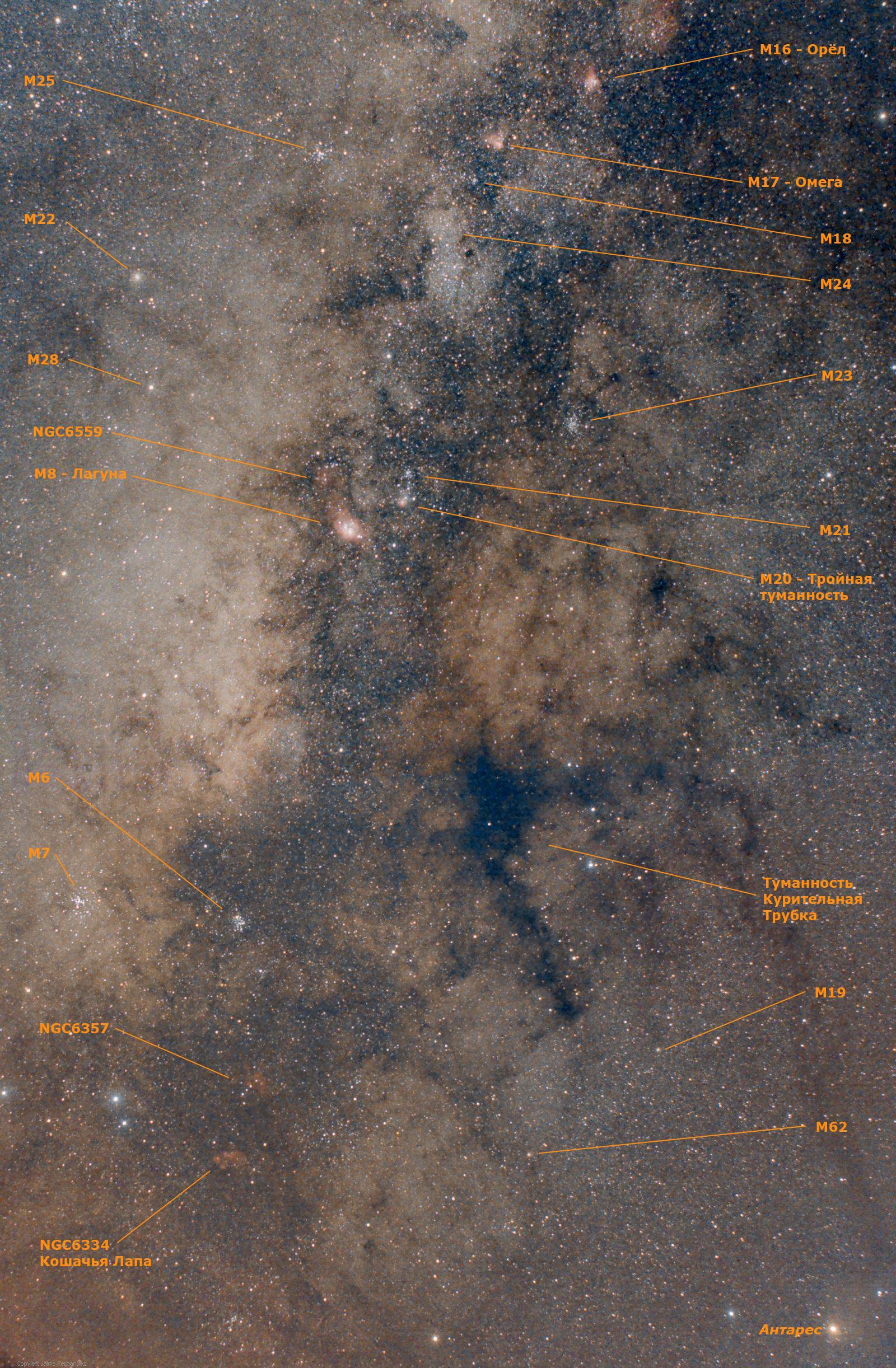 Если смотреть на небо в сторону центра нашей галактики, то можно увидеть, что он заполнен широким спектром небесных чудес, многие из которых можно увидеть в обычный бинокль вдали от городов. Вблизи центра галактики расположились созвездия Стрельца, Весов, Скорпиона, Щита и Змееносца. Среди туманностей — объекты Мессье: M8, M16, M20, а также Туманность Курительная Трубка и Туманность Кошачья Лапа. Также видны следующие звездные скопления, включающие в себя M6, M7, M21, M23, M24 и M25, видно даже шаровое звездное скопление М22. Дыра в пыли (известная как Окно Бааде), недалеко от центра галактики, открывает нам яркие области, заполненные далекими звездами. Она видна между M7 и M8.