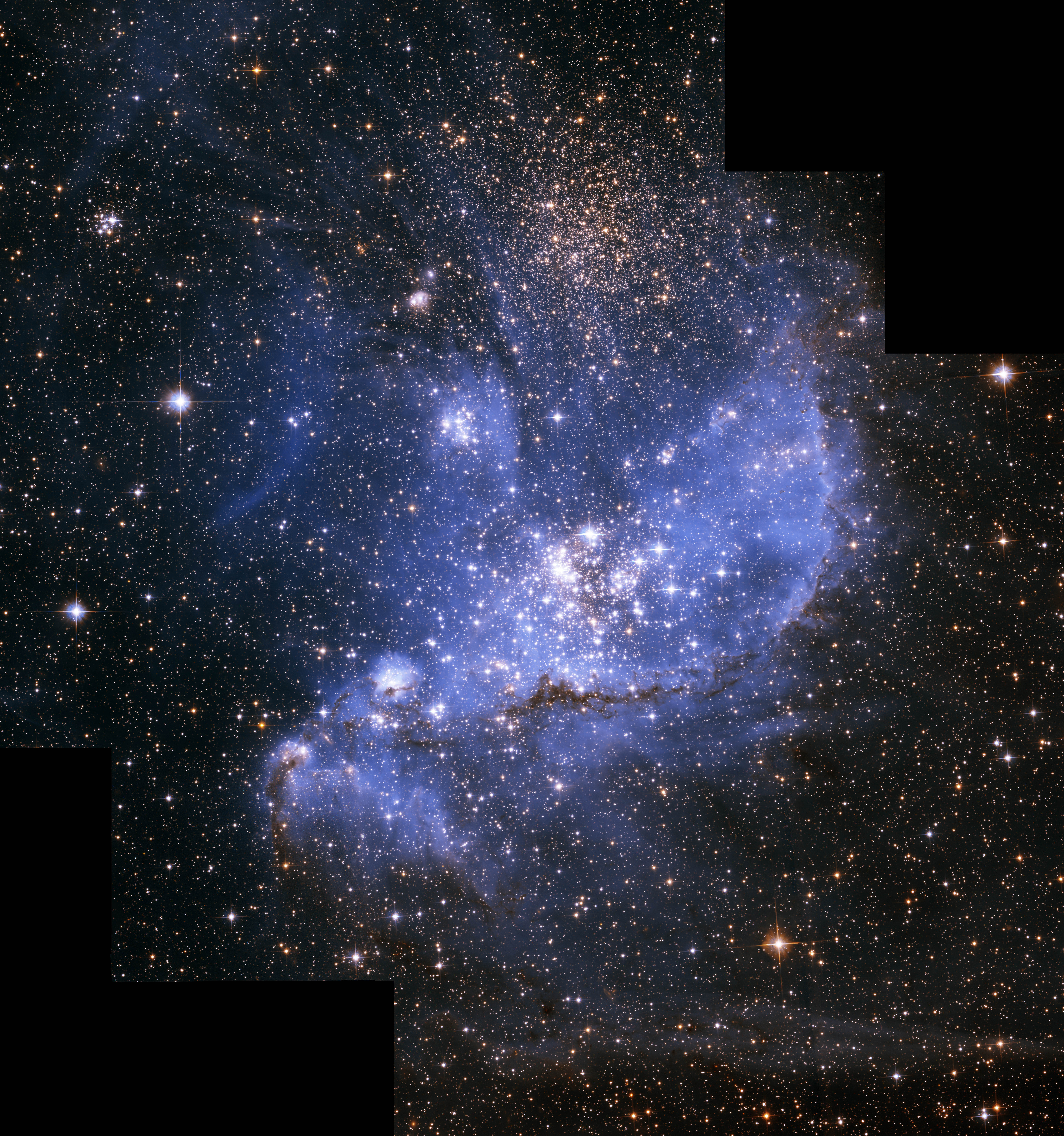 Как, и в результате чего сформировались все эти звезды? Туманность NGС 346 была обнаружена среди скоплений Малого Магелланова Облака. Она охватывает около 200 световых лет в поперечнике. Эта фотография была сделана телескопом Хаббл. Галактика-спутник Млечного Пути, Малое Магелланово Облако (SMC) — чудо на южного неба, расположившееся от нас на расстоянии 210 000 световых лет в созвездии Тукана. Изучающие NGC 346 астрономы обнаружили популяцию звезд в эмбриональной стадии вдоль темных пересекающихся пылевых полос, которые можно увидеть справа. Продолжающиеся процессы уплотнения внутри натальных облаков сделали свет от звездных младенцев красноватым, благодаря вмешательству пыли. Небольшая галактика неправильной формы (SMC) представляет собой тип галактик, которые особенно сильно были распространены в ранней Вселенной. Но эти маленькие галактики, как считается, являлись строительными блоками для более крупных галактик, существующих сегодня. Звездные ясли в SMC, такие как NGC 346 также считаются похожими на те, которые существовали в ранней Вселенной.