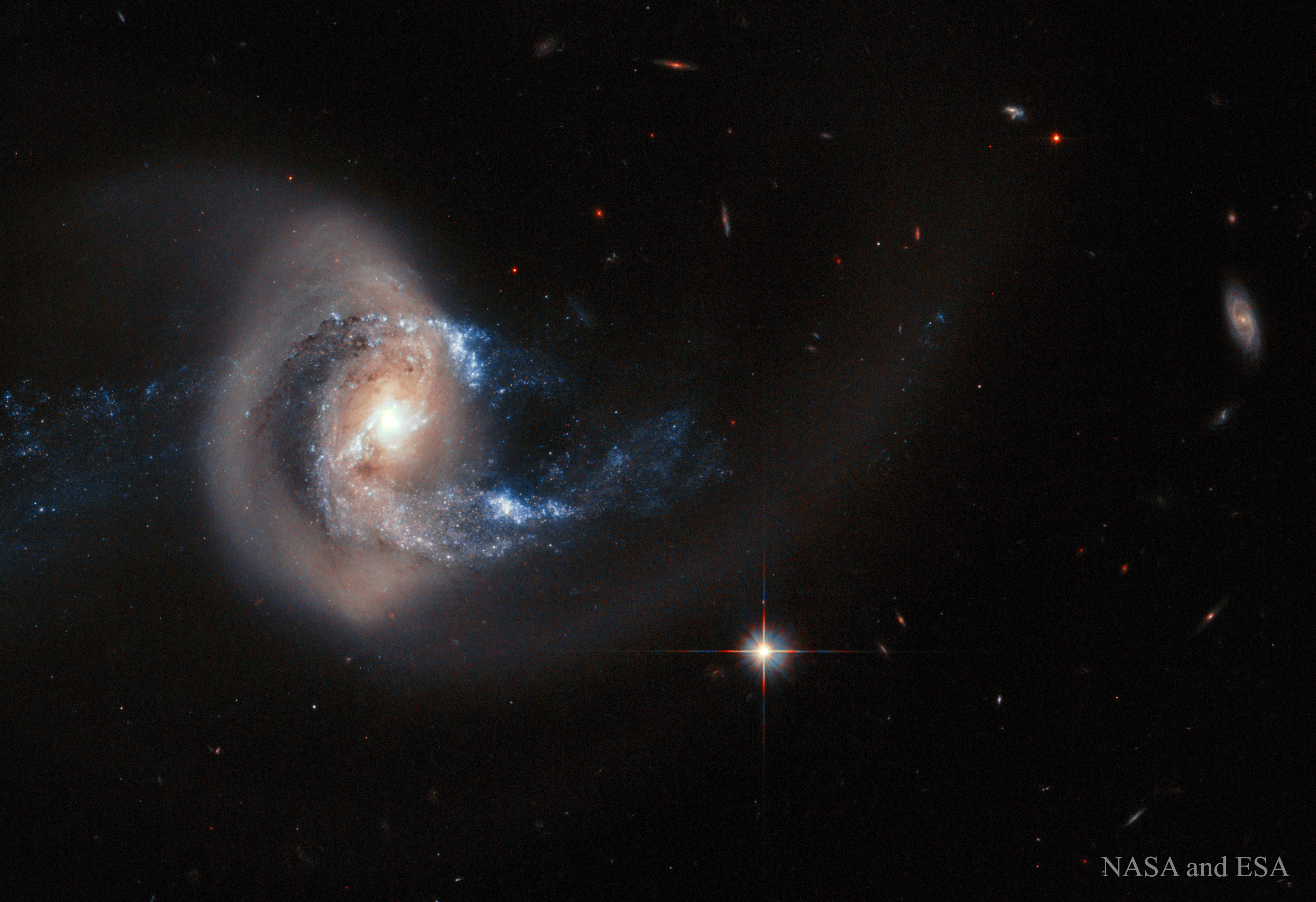Эта галактика что, прыгает через гигантское звездное кольцо? Наверное, нет. Хотя точная динамика, стоящая за этим изображением, до конца не ясна, понятно, что изображенная на этой картинке галактика NGC 7714 была растянута и искажена недавним столкновением с соседней галактикой. Считается, что меньший ее сосед, NGC 7715, расположенный слева на этом изображении, прошел прямо сквозь NGC 7714. Судя по наблюдениям, золотое кольцо, видимое на фотографии, состоит из миллионов старших звезд, похожих на Солнце, которые скорее всего движутся вместе с голубыми звездами, находящимися внутри. С другой стороны, похоже, что яркий центр NGC 7714 находится на стадии вспышки звездного формирования. NGC 7714 расположена на расстоянии около 100 миллионов световых лет в направлении созвездия Рыб. Скорее всего, взаимодействия между этими галактиками начались около 150 миллионов лет назад и будут продолжаться еще несколько сотен миллионов лет, в результате чего они сольются в одну болшую галактику.
